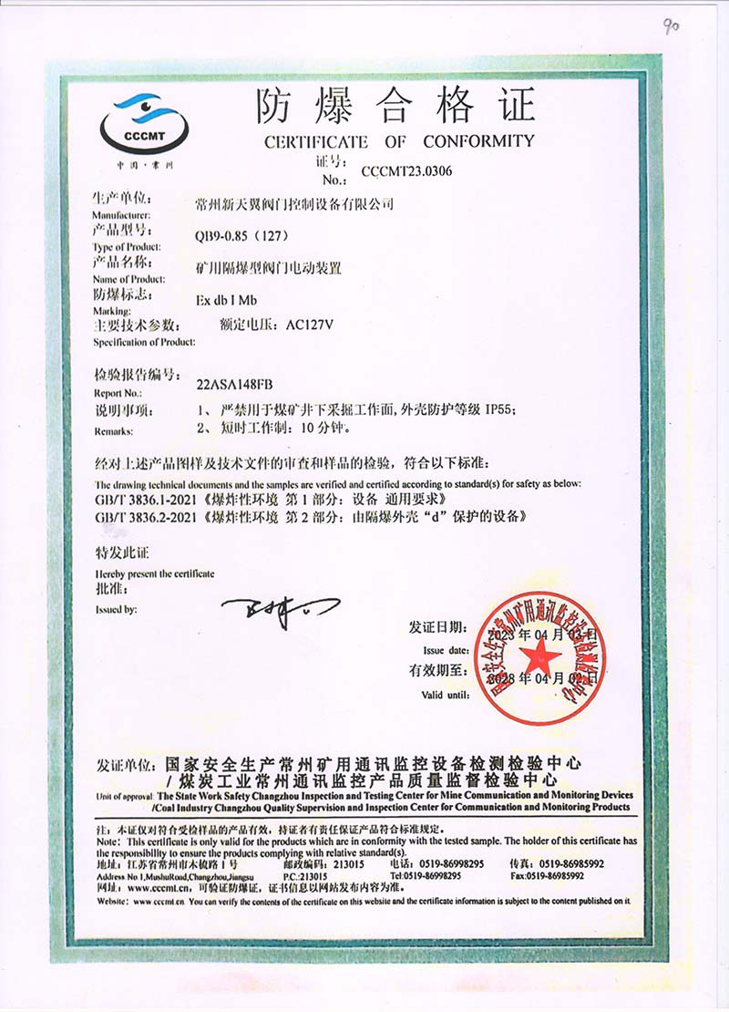 礦用隔爆QB127V中國國家強制性產品認證證書105.2